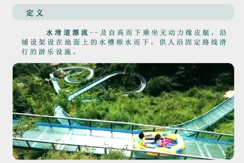 隨著我國旅游行業的迅猛發展,漂流已經成為人們最為喜愛的親水項目(漂流單只娛樂型項目,不包括黃河漂流等探險項目)。漂流在旅游市場上主要分兩種,一個是自然河流的大型生態漂流,這個漂流我們現在不做討論和分析。現在我主要剖析第二種水滑道滑槽試漂流。且不論工藝是水泥澆筑還是玻璃鋼或是玻璃的,單從漂流形式上區分,水滑道漂流目前在中國旅游市場上也主要分為兩種類型: